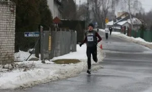 Nie mam pojęcia ile razy “odjechała” mi noga, ale ślady na ziemie przede mną wyraźnie świadczyły, że nie tylko ja mam problemy z równowagą. Na 7 kilometrze spotkaliśmy górkę. Ogólnie podbieg nie był zbyt długi, ale na śliskiej trasie było to wyzwanie. O jego trudności niech świadczy to, że średnie tempo z biegu spadło mi na niej o 2 sekundy, a muszę przyznać, że starałem się nie zwolnić. Moim płucom się to spodobało 🙂 Później już tylko seria zbiegów, na których o mało nie zaliczyłem ślicznej gleby. Zbieganie po drodze składającej się z dwóch zasypanych śniegiem kolein i przewyższenia po środku napawa mnie lękiem.