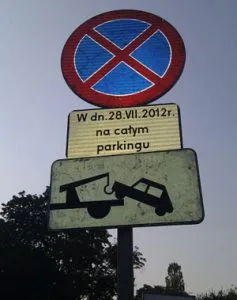 Po paru minutach dotarliśmy pod stadion Polonii, gdzie przywitał nas znak mówiący, że na parkingu obowiązuje zakaz parkowania i odholują nam auto.